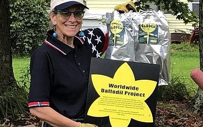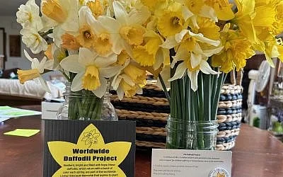 Daffodils donated by a survivor of the Holocaust, the pin and card, the mini sign.